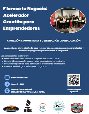 - Conexión Comunitaria y Celebración de Graduación – 23 de marzo, Nuestra Communidad 21 Bluebird Drive, Windsor, CA 95492